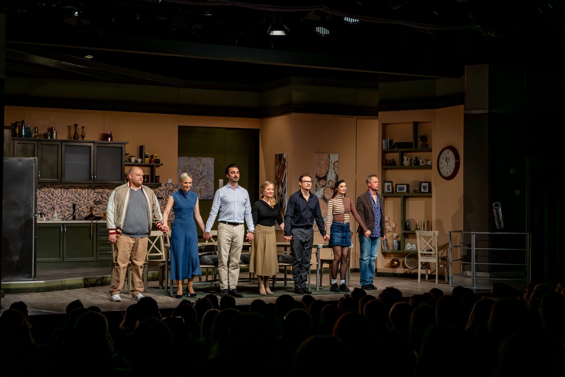 Az előadásban Annát, a pszichológust Hajdú Melinda, férjét, a plasztikai sebész Palit Orth Péter alakítja. A baráti társaság tagjai hozzájuk érkeznek vacsoravendégségbe. Márton, a sztárügyvéd szerepében Adorjáni Bálint és Kovács Lehel váltják egymást, a szintén ügyvéd feleség Flórát Märcz Fruzsina játssza. Pankát, az állatorvost Venczli Zóra, Ricsit, a taxisofőrt Lakatos Máté, míg Eriket, a tanárt Konfár Erik formálja meg. Anna és Pál lányát, Zsófit a Nemzeti Dobogó növendékei, Matuska Villő és Jekkel Anna játsszák felváltva.
